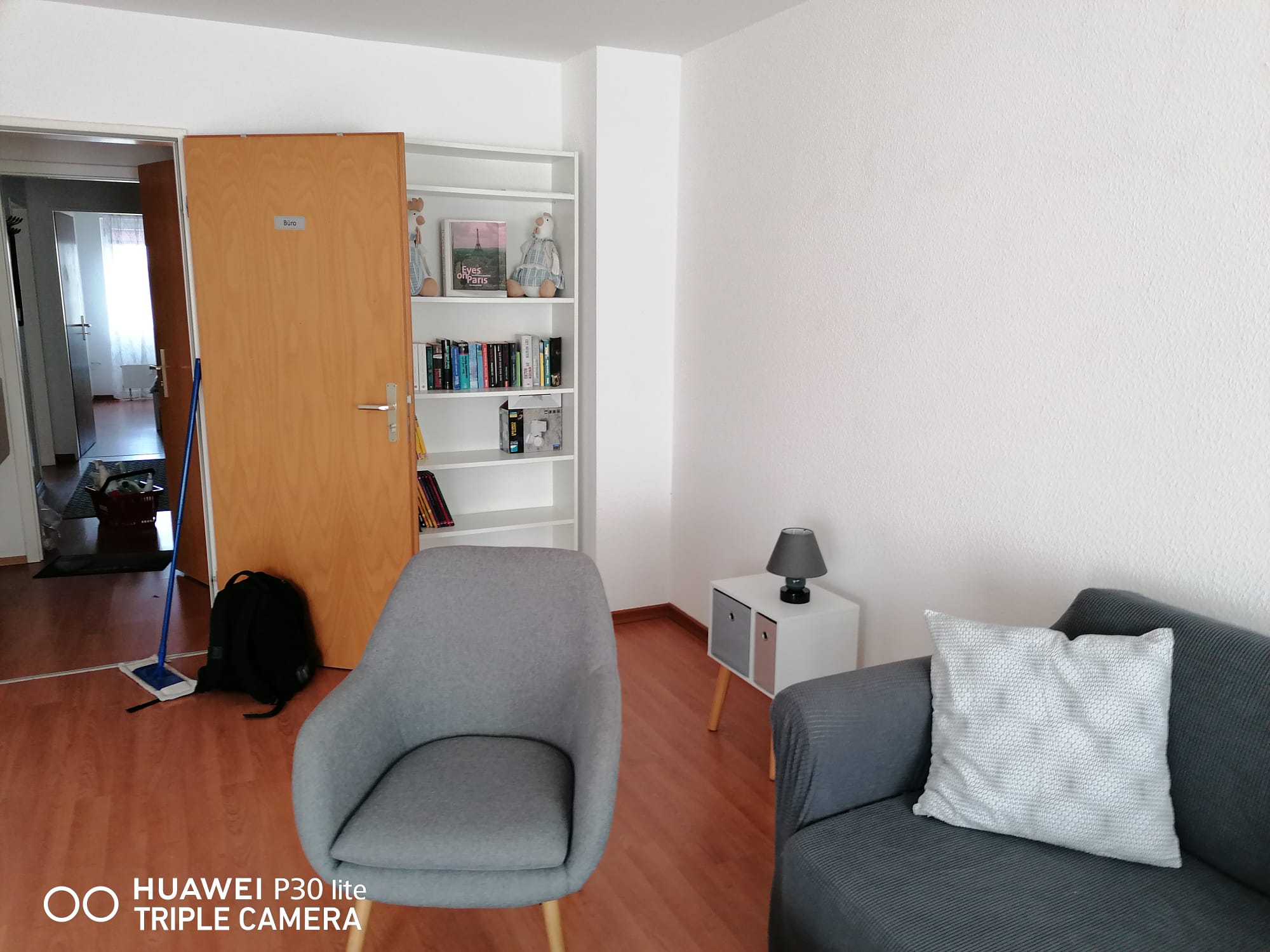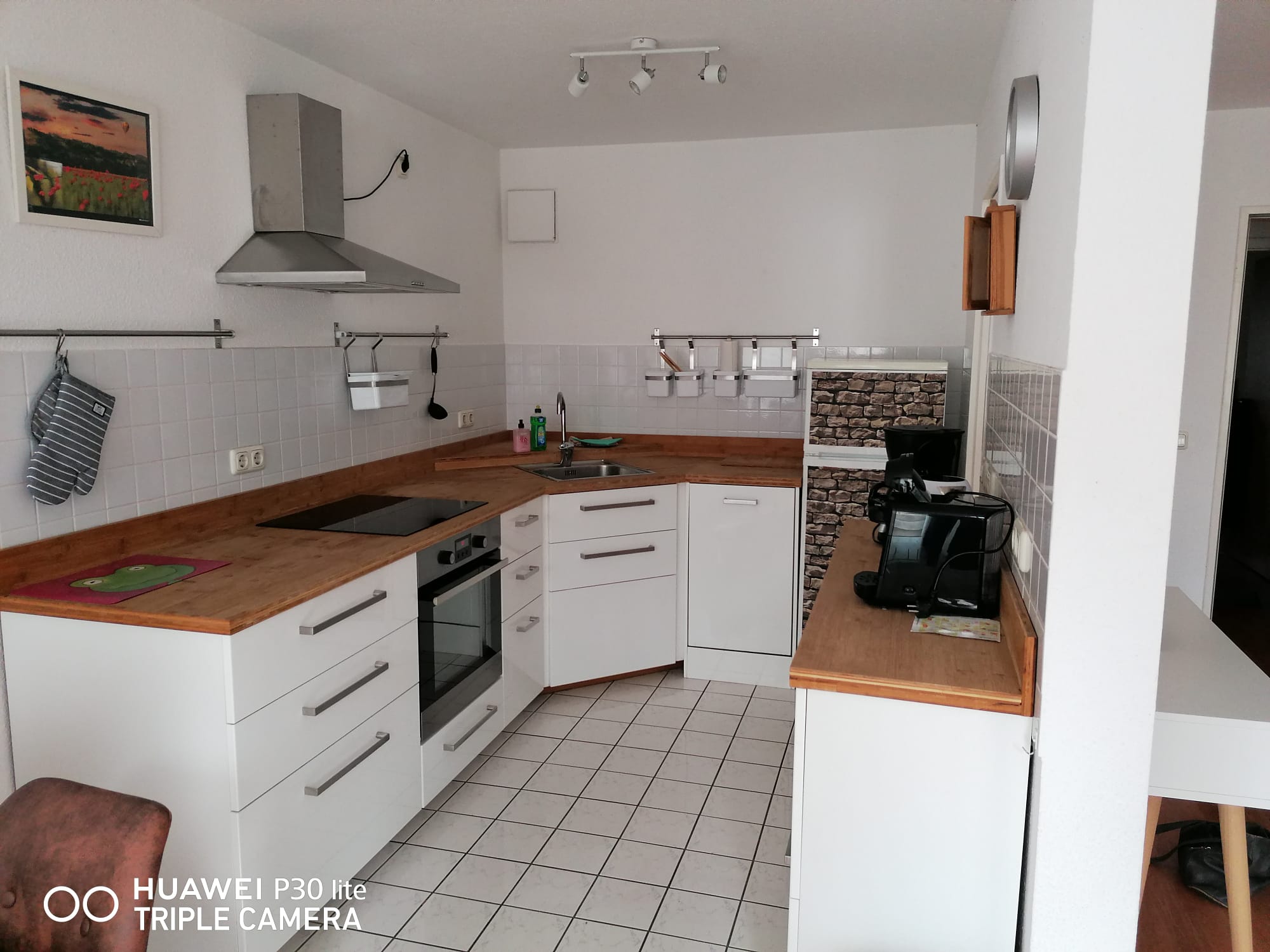 Ein Wohnzimmer, einen Flachbild TV, eine vollausgestatteter Küche und einen Balkon zur Hofseite.